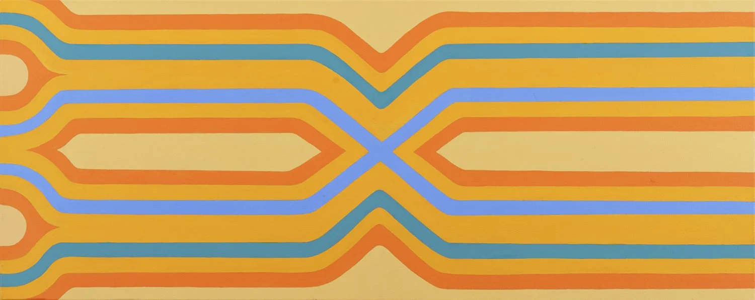"Chiasm i" stylizes the information highway from the right and left visual fields to the corresponding visual hemispheres of the brain, starting in the retina and ending in the lateral geniculate nucleus (LGN). The LGN receives signals from the ganglion cells of the retina and sends those signals to the visual cortex. (40" X 16”)